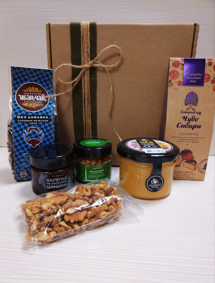 Оригинальный подарок, который станет отличным праздничным комплиментом. Набор состоит оригинального десерта орех в сосновом (черничном) сиропе, упаковки кедровых конфет, натурального меда и Иван-чая мужской серии с добавлением жмыха кедрового ореха и чаги.