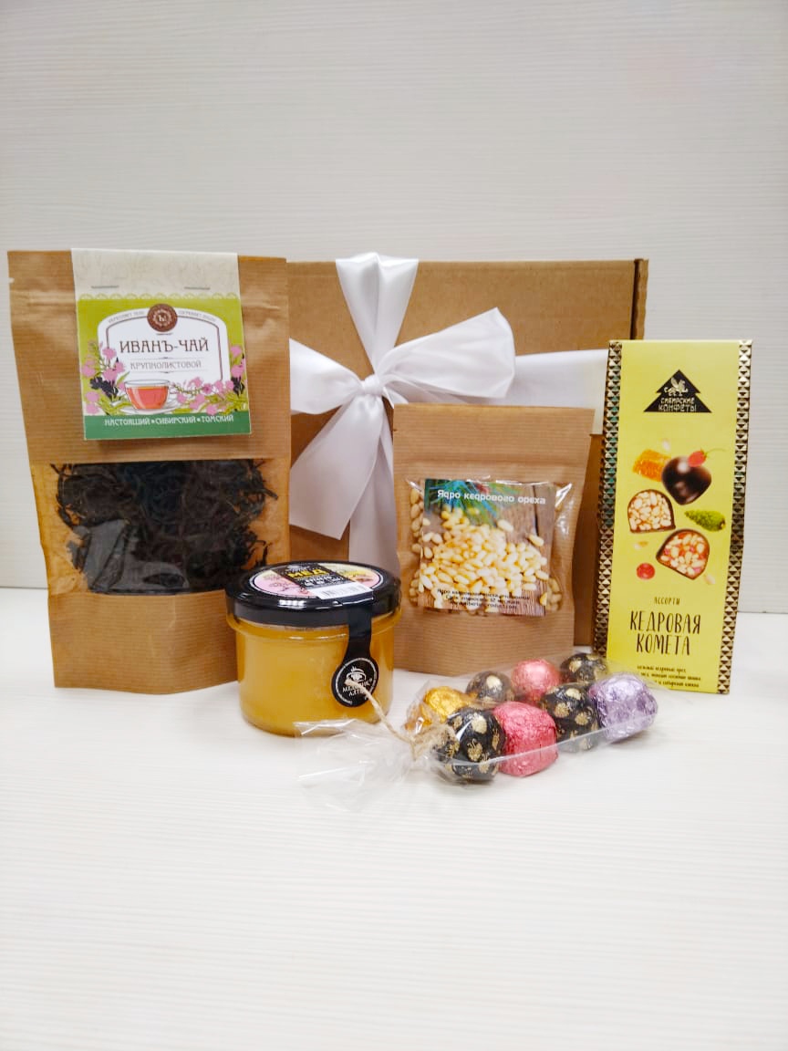 Наполнение: Мед Луговой 0,2л , конфеты Кедровая комета 70 гр., Конфеты кедровый грильяж 4 шт ., ядро кедрового ореха 60 гр, Иван чай с травами 30 гр , Конфеты мармелад в шоколадной глазури 4 шт.