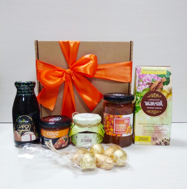 Наполнение: Варенье облепиха 0,3л , Сироп кедровый 0,2л., Иван чай с облепихой и брусникой и 50 гр, Соус облепиховый 0,1л., мед луговой 100мл, Конфета фрутодень с кедровым орехом 3 шт, Конфеты кедровый грильяж 3 шт.