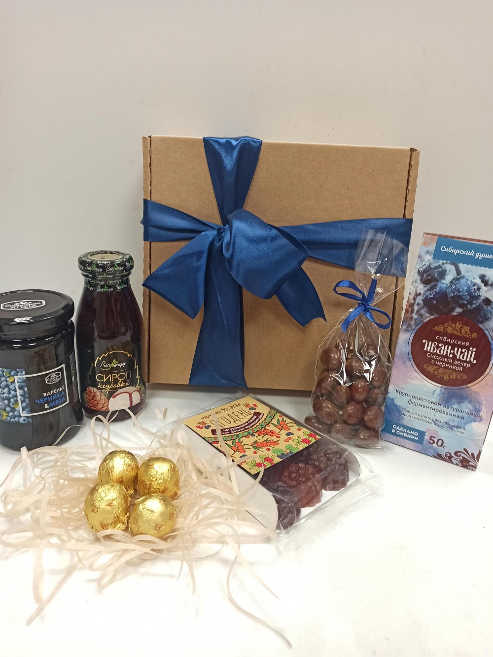 Наполнение можно изменить. При покупке оптом, действуют скидки.Наполнение: Варенье черника с мятой 0,3л , Сироп кедровый 0,2л., Иван чай с черникой и 50 гр, Мармелад ассорти, Фундук в глазури 100 гр ., кедровый грильяж 4 шт