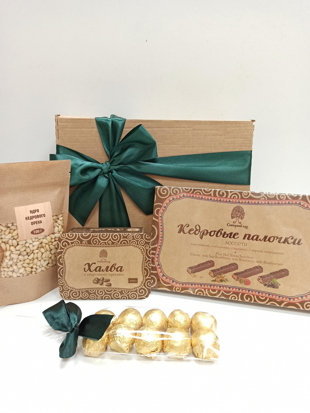Наполнение: Орех кедровый 100 гр, Палочки кедровые ассорти 190 гр, грильяж кедровый 10 шт, халва кедровая 200 гр