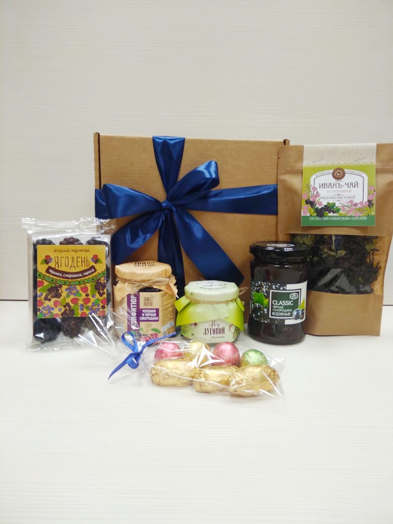 Наполнение: Варенье черная смородина 0,3л , Конфитюр черешня и черная смородина , Иван чай со смородиной 30 гр, мед цветочный 200 гр, Мармелад ассорти 165 гр, Конфета фрутодень с кедровым орехом 3 шт, Конфеты кедровый грильяж 4 шт.