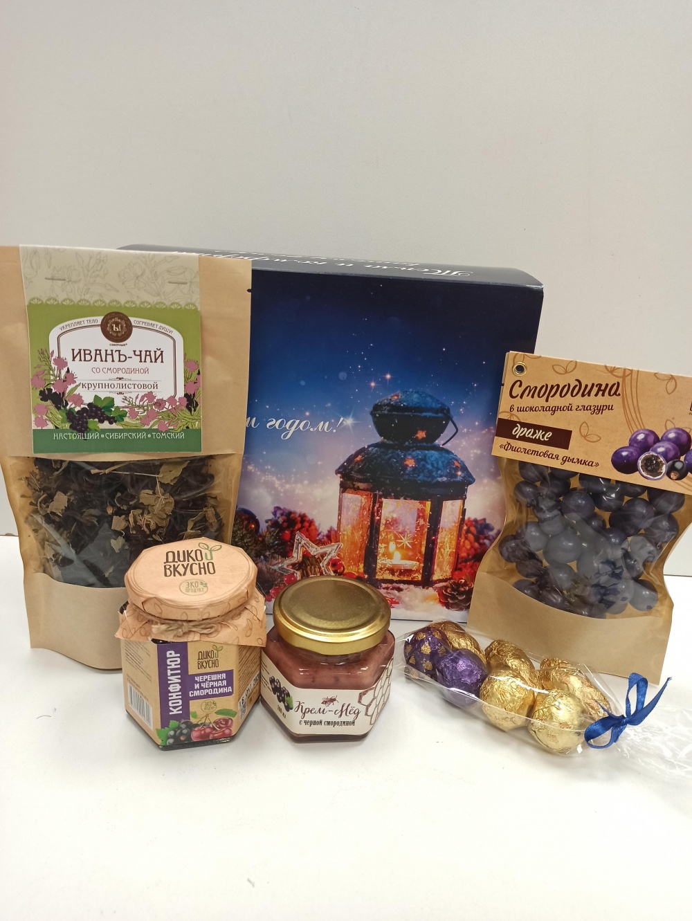 Наполнение: Конфитюр черешня и черная смородина , Иван чай со смородиной 30 гр, мед цветочный 250 гр, Конфеты кедровый грильяж 4 шт.