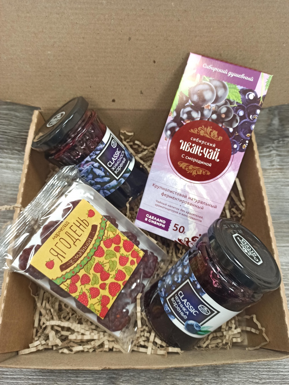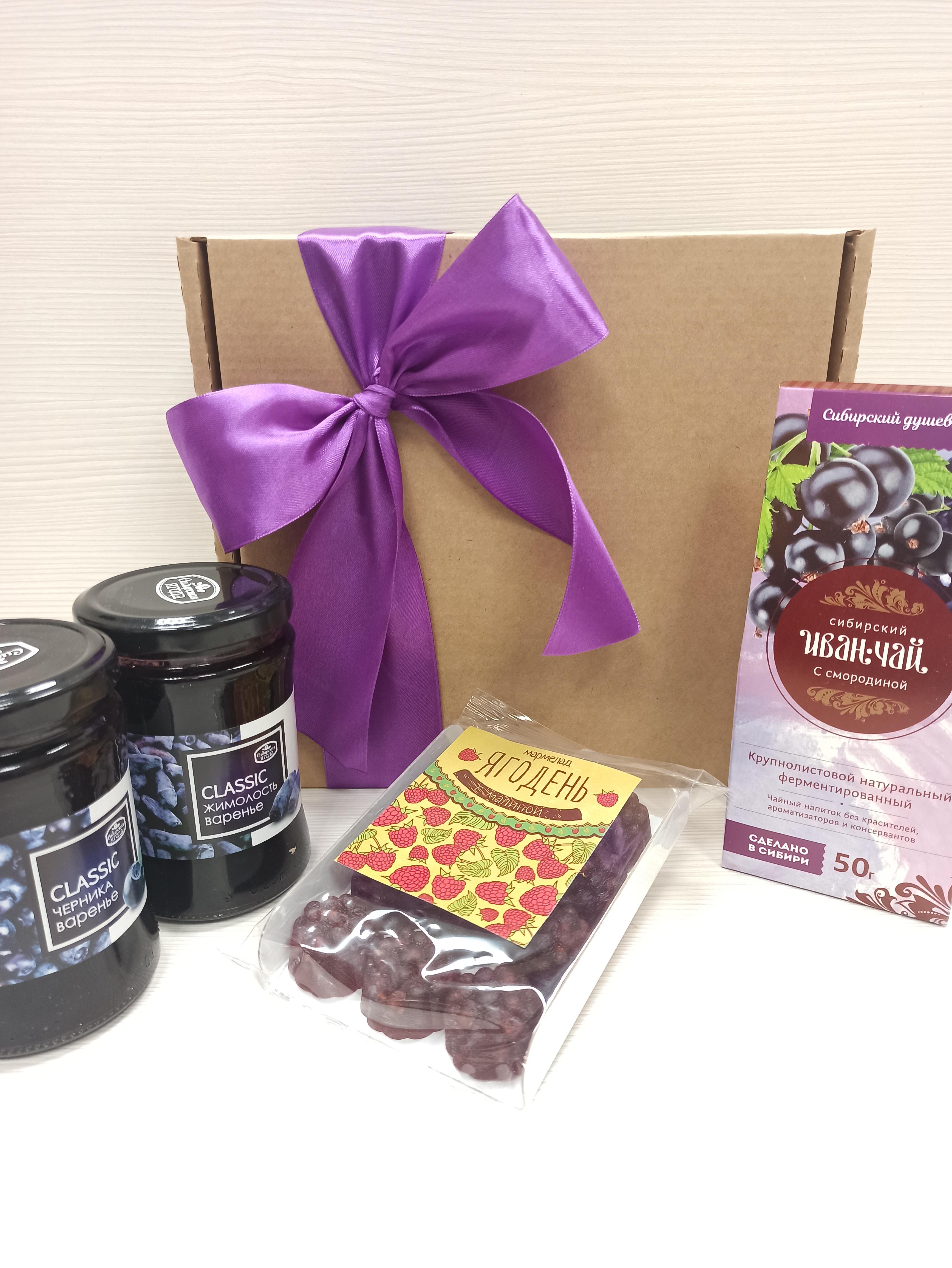 Наполнение: Варенье из жимолости 0,3, Варенье из черники 0,3, Мармелад ягодный ассорти на подложке 165 гр, Иван чай со смородиной 50 гр .