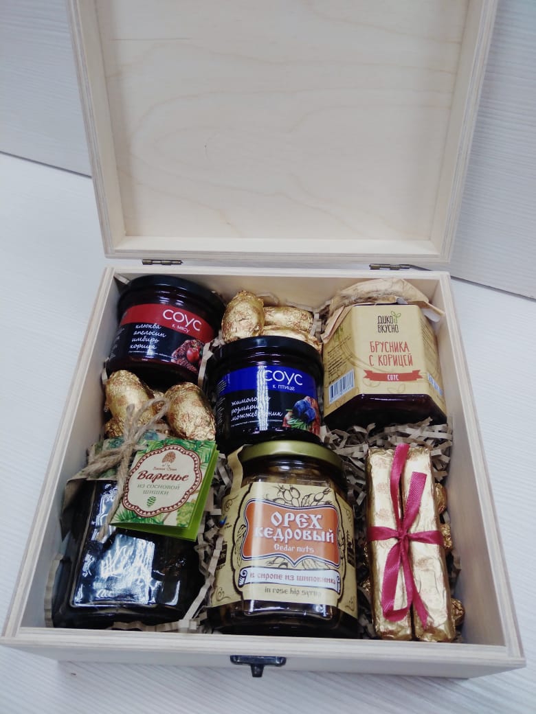 Представляем Вам подарочный набор с наполнением из самых вкусных и полезных сладостей. На крышке сундучка может быть размещен логотип Вашей компании или любые поздравления и пожелания. Такой набор с истинно русской сибирской душой станет отличным подарком как для Ваших близких и родных, так и для сотрудников или деловых партнеров.