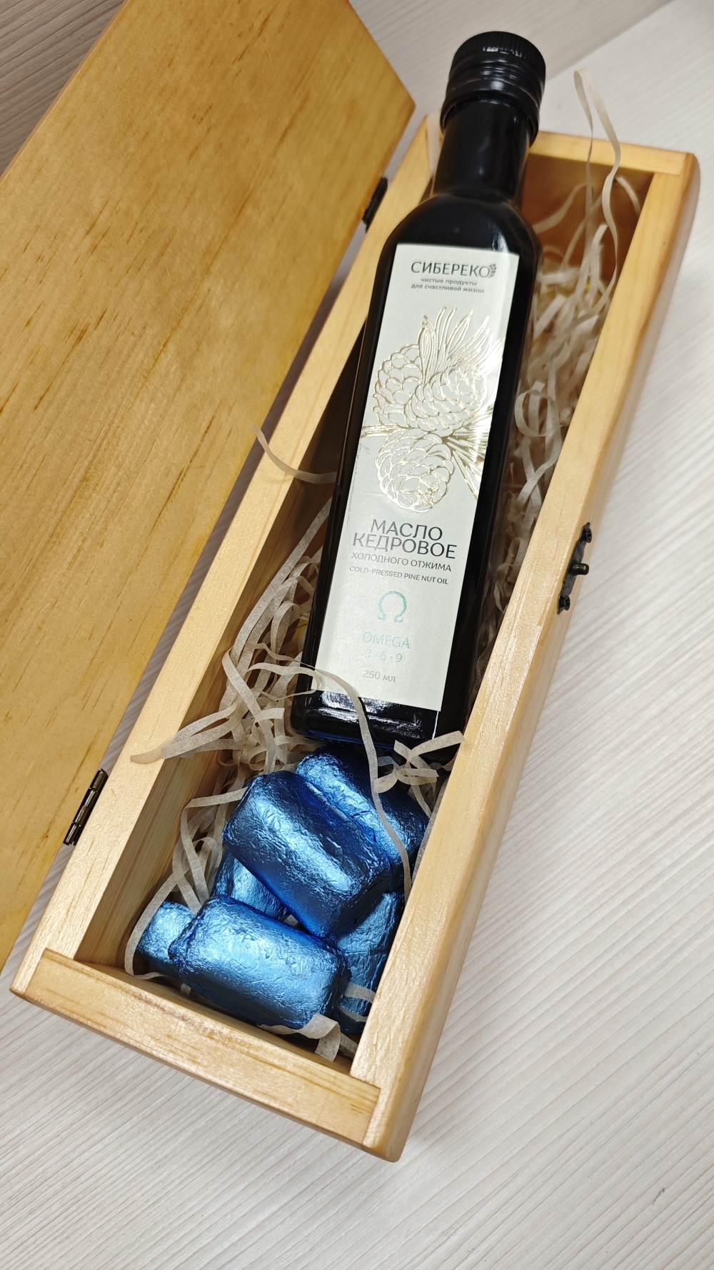 Наполнение:Масло кедрового ореха сыродавленное 250 мл, Конфеты кедровая метелица 6 шт