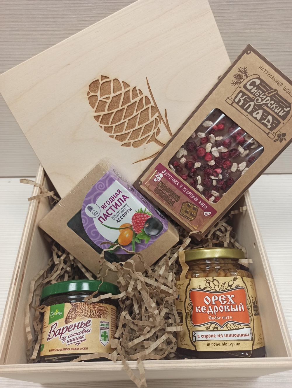 Наполнение: Шишковое варенье (140 гр), Кедровый орех в сиропе шиповника (220 гр), Молочный шоколад, брусника и жмых кедрового ореха (100 гр), Ягодная пастила (100 гр).