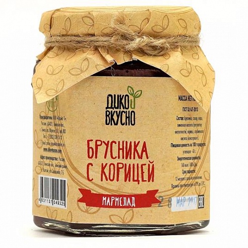 Состав: брусника, сахар, вода, корица молотая, пектин, регулятор кислотности лимонная кислота, консервант сорбиновая кислота.