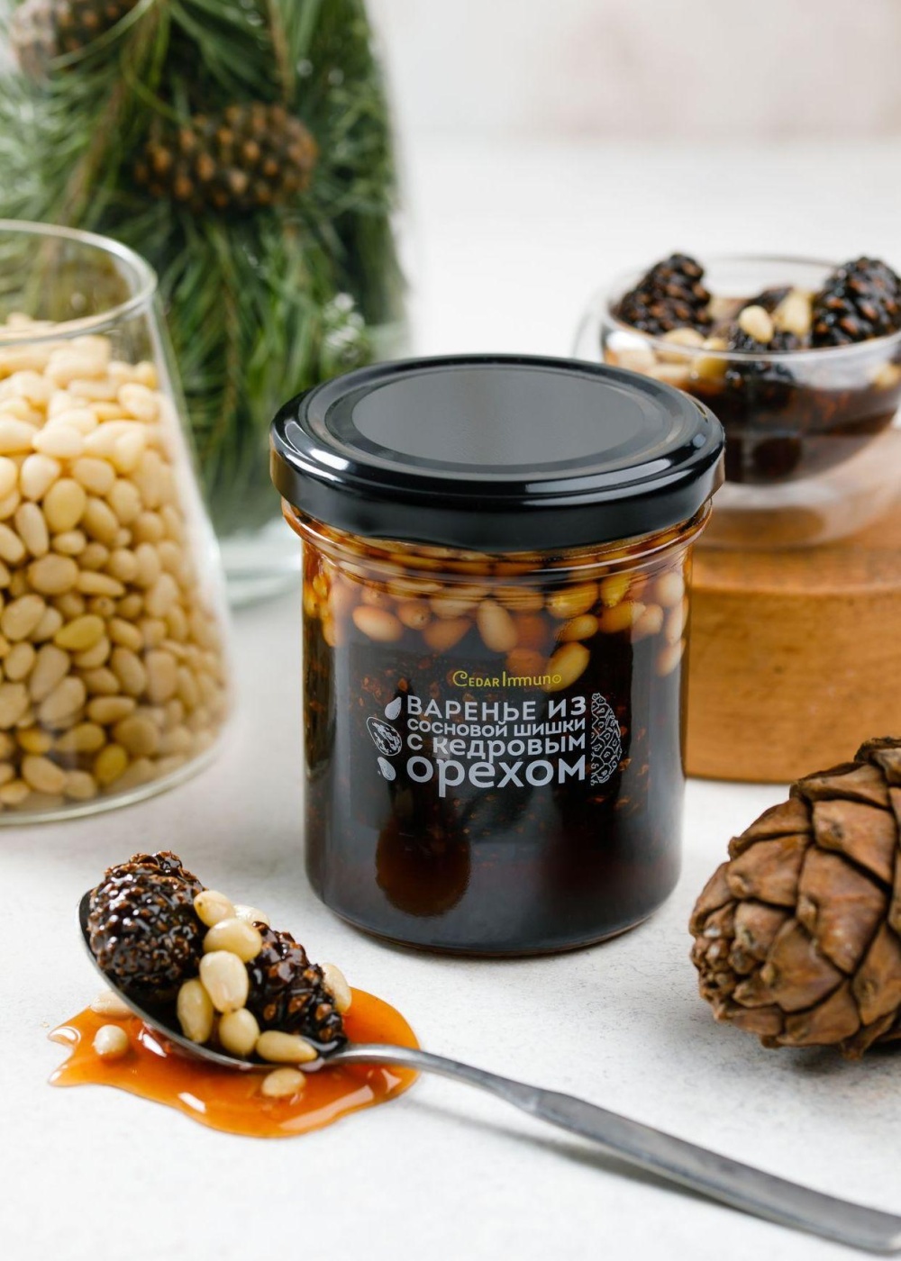 Сибирское варенье- это настоящее лесное варенье! Уникальность продукта в одновременном сочетании ядра кедрового ореха и молодых шишечек , томящихся в сосновом сиропе. Кедровый орех содержит практически все незаменимые аминокислоты, полиненасыщенные жирные кислоты, широкую группу витаминов. Молодые сосновые шишки, сваренные по особой рецептуре сохраняют сохраняют в себе не только массу витаминов, но также и танины и фитоциды, что волшебным образом помогает восстановить защитные силы организма.