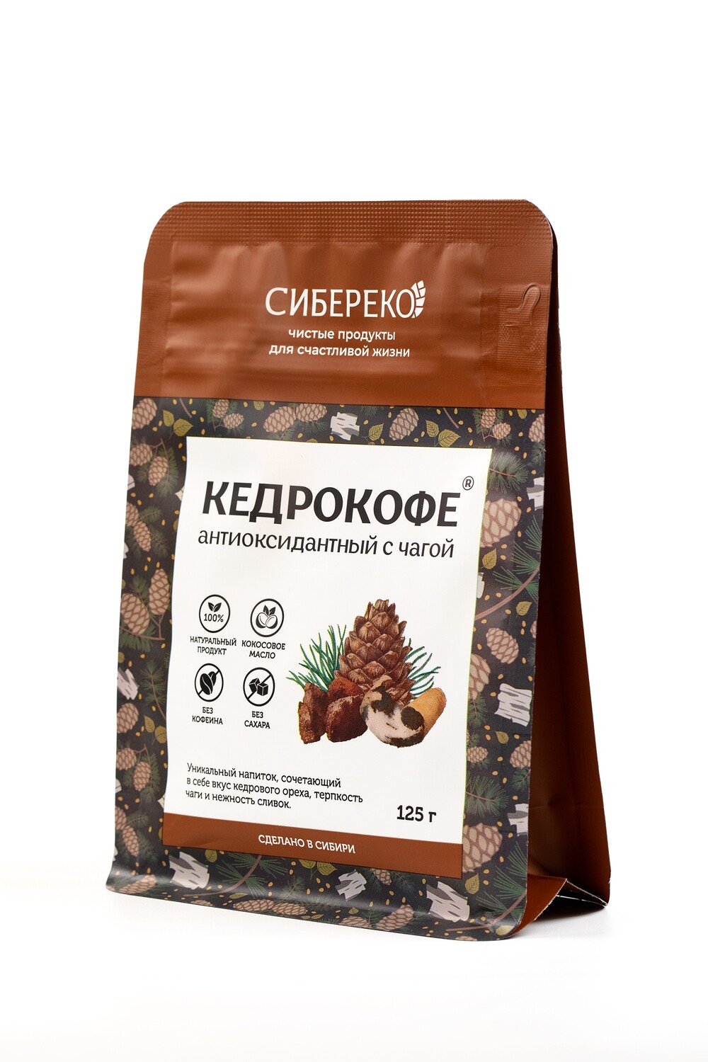 Кедрокофе – натуральный напиток из цельного кедрового ореха, разработанный мастерами компании SIBERECO. Напиток сочетает в себе тонкий вкус и аромат кедрового ореха, нежных сливок. Хотя продукт называется «Кедрокофе», в его состав не входят ни кофе, ни имитирующие его вкус цикорий или зерновые. Свои названием Кедрокофе обязан бодрящему и тонизирующему действию, которое напиток оказывает на организм. Мягкий вкус напитка станет отличной альтернативой для людей, которые следят за здоровьем и отказываются от кофеина. Кедрокофе не вызывает привыкание, не перегружает нервную систему и не повышает артериальное давление. Подходит для детей и женщин во время беременности и лактации. При заваривание напиток дает натуральный (съедобный) осадок, поэтому рекомендуем использовать френч-пресс либо кофеварку, как для молотого кофе.