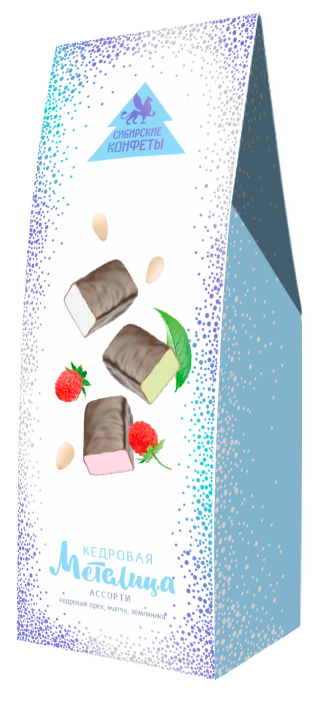 Кедровая метелица - это нежное молочное пралине с добавлением кедрового ореха, лесной земляники и японского чая матча, покрытое шоколадной глазурью.