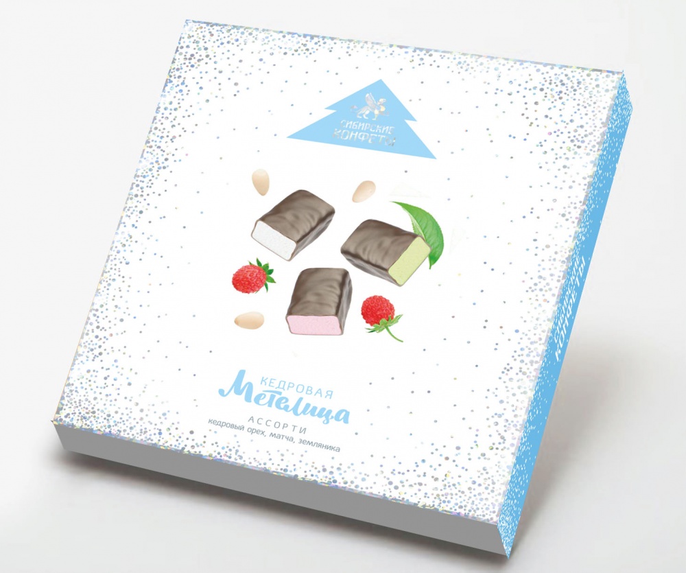 Кедровая метелица - это нежное молочное пралине с добавлением кедрового ореха, лесной земляники и японского чая матча, покрытое шоколадной глазурью.