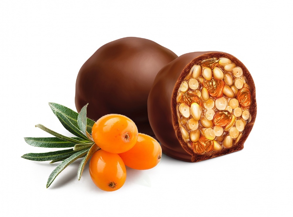 Состав: кедровый орех, орех кешью, облепиха вяленая, мёд натуральный, шоколадная глазурь ( сахар-песок, какао-масло, какао-порошок, эмульгатор лецитин).
