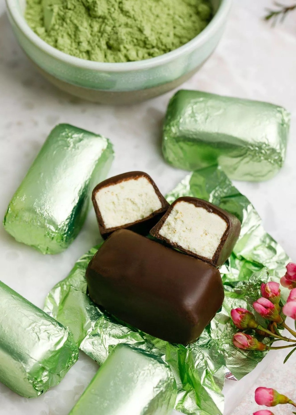 Состав: Шоколадная глазурь ( сахар, масло какао, какао-порошок, лецитин соевый (эмульгатор)), сахар, молоко сухое цельное, ядро кедрового ореха, масло кокосовое,матча, эквивалент какао-масла.